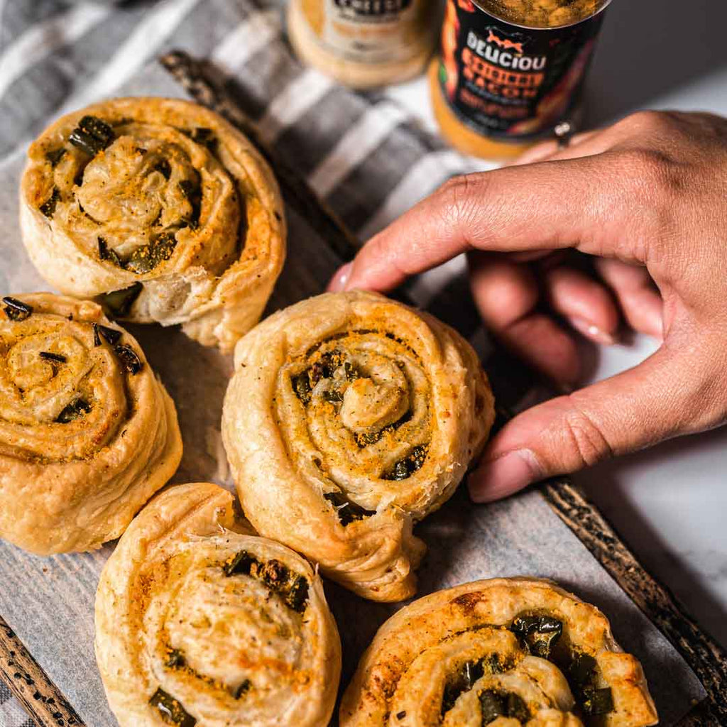 - Spread the entire pastry sheet with butter. Sprinkle generously all over with Deliciou Original Bacon Seasoning, Deliciou Vegan Cheese Seasoning (or vegan cheese) and chopped jalapenos, then roll loosely into a log.