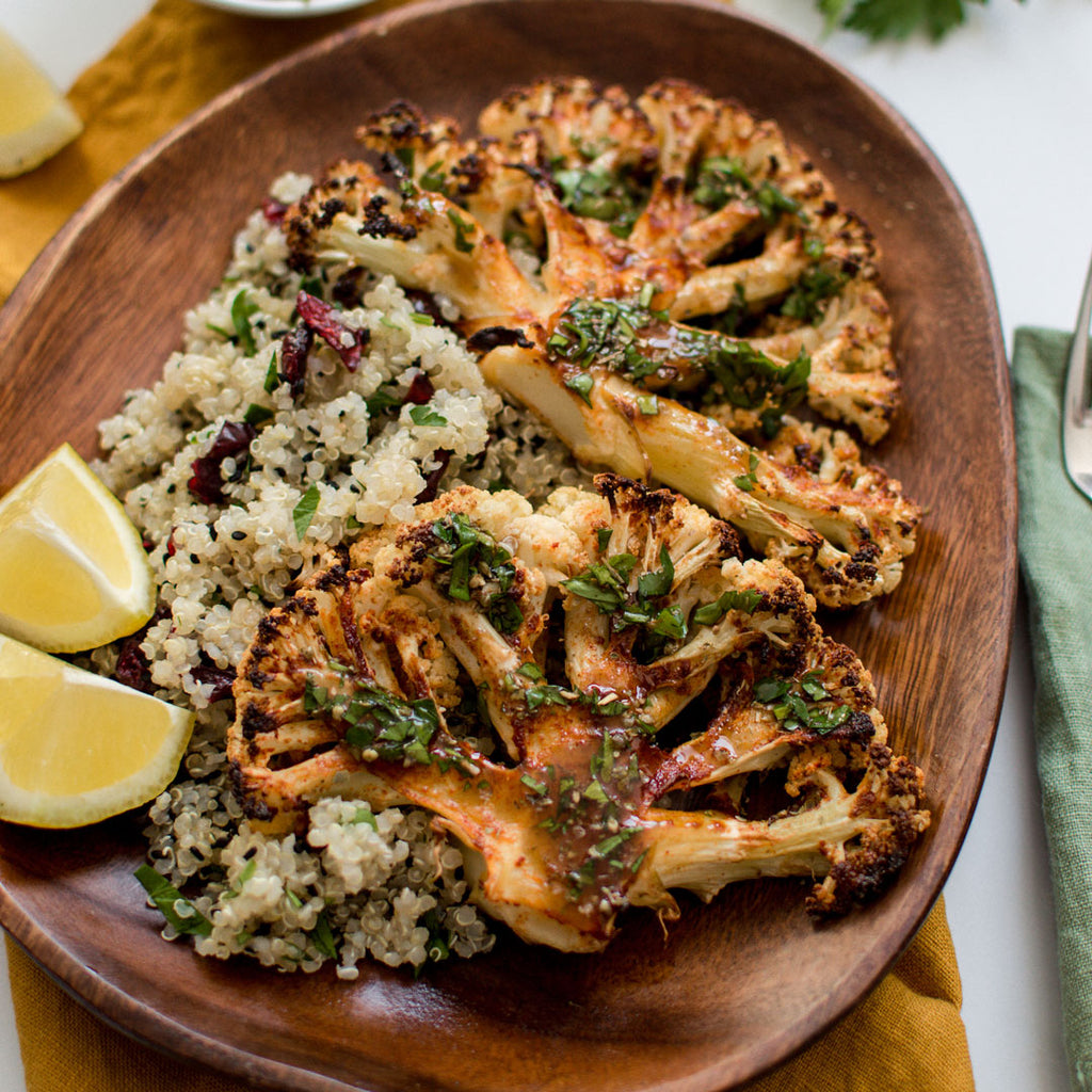 7. Serve your BBQ cauliflower steaks with a generous helping of quinoa salad and top with that irresistible chimichurri sauce. Yum!