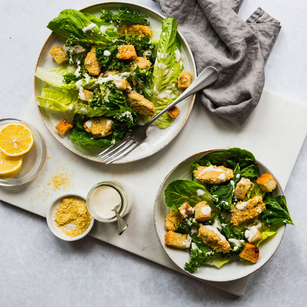 Miss the taste of a good old fashioned creamy Caesar salad? Well you don’t have to! This simple vegan chicken Caesar salad is our go-to crowd pleaser. Creamy and crunchy, with a delightful tang, it makes for a filling lunch or a delicious side. You’ll be smiling as you watch your friends dig in, because they won’t believe how good it tastes - and it’s 100% plant-based!