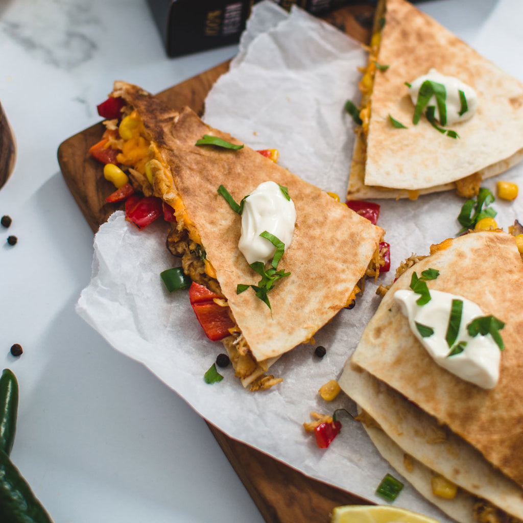 These quesadillas are so addictive! Gooey and melty with cheese and filled with a hearty and tasty plant-based chicken filling.