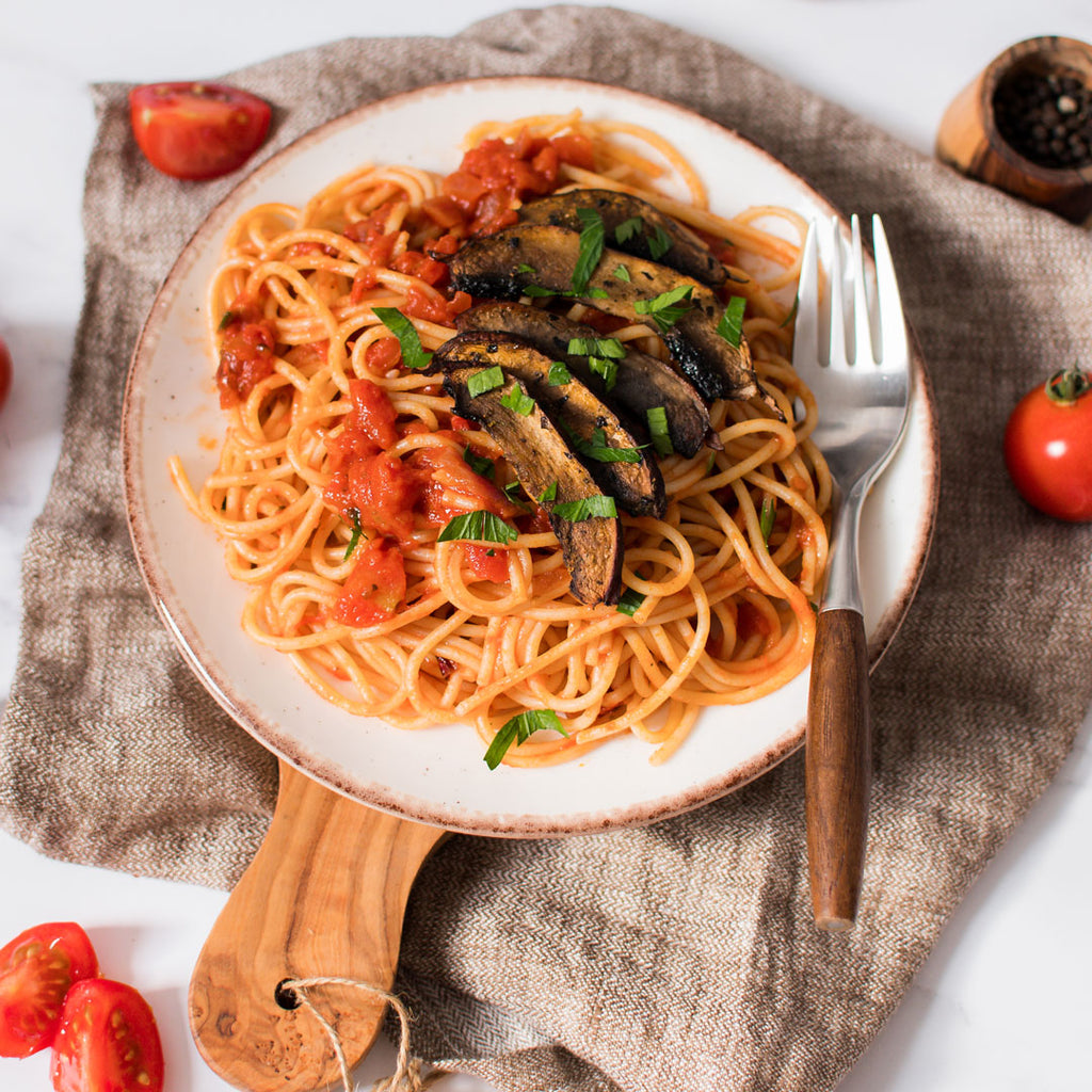 Level up your pasta game with some crispy bacony mushrooms! The mushrooms add a great meaty texture and flavour and pair very well with the tomato-based sauce. These bacon mushrooms are a great topper on other pasta dishes, soups and salads!
