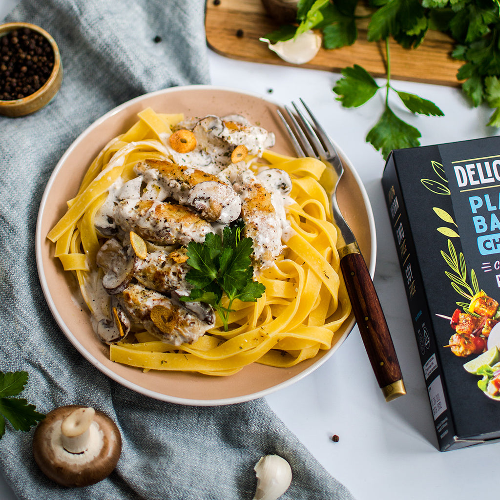 • Add some oil to a hot pan and start by cooking the garlic together with Deliciou Plant-Based Chicken and the sliced mushrooms.