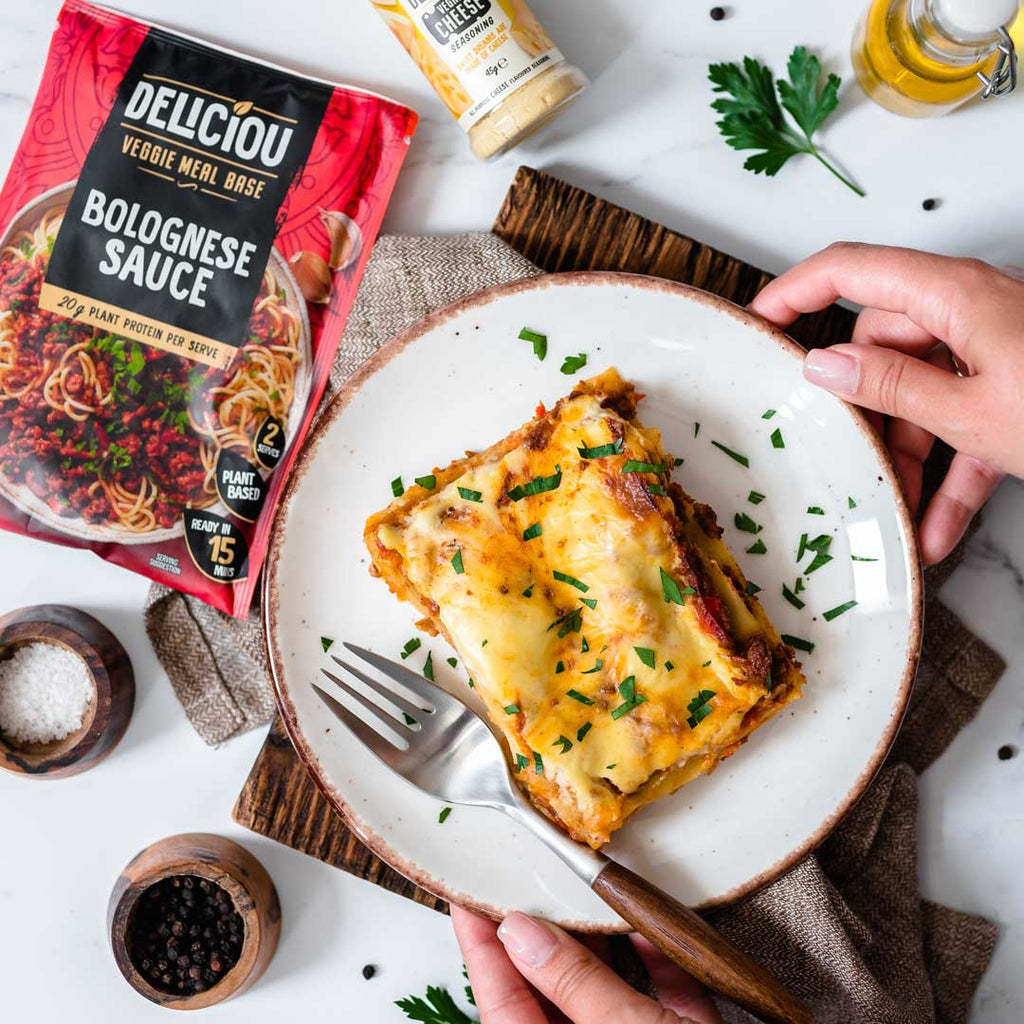 Craving lasagne but don’t have hours to spare? Try this delicious and much faster plant-based lasagne recipe! Cut out the hours of making bolognese sauce with our Bolognese Veggie Meal Base, and have this epic cheesy vegan lasagne in the oven in 20 mins.