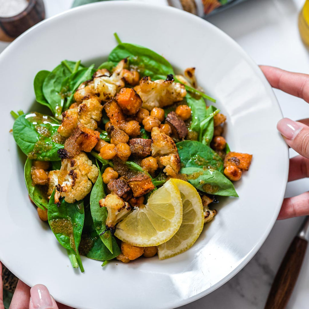 - In a large bowl, make layers of spinach topped with roasted vegetables. Continue layering like this until all the ingredients are used up. Give the dressing another mix, then drizzle all over the salad. Toss, then enjoy...guilt-free!