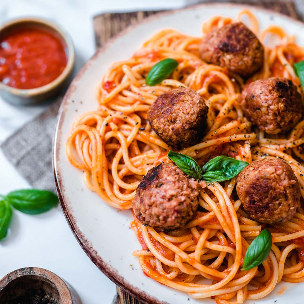 - Serve the spaghetti in bowls and top with meatballs. Garnish with basil and buon appetito!