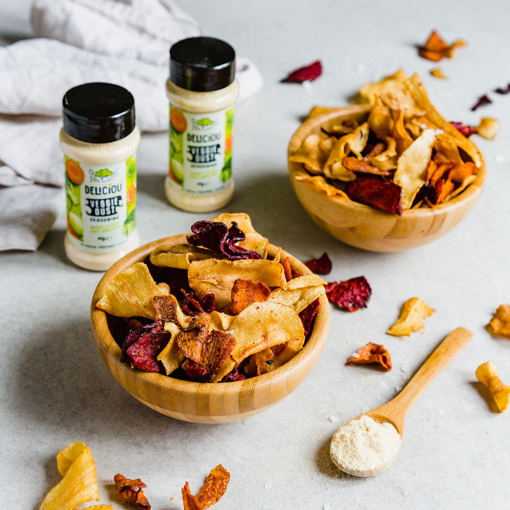 - Once golden and crispy, sprinkle with extra Veggie Dust Seasoning and serve your tasty chips!