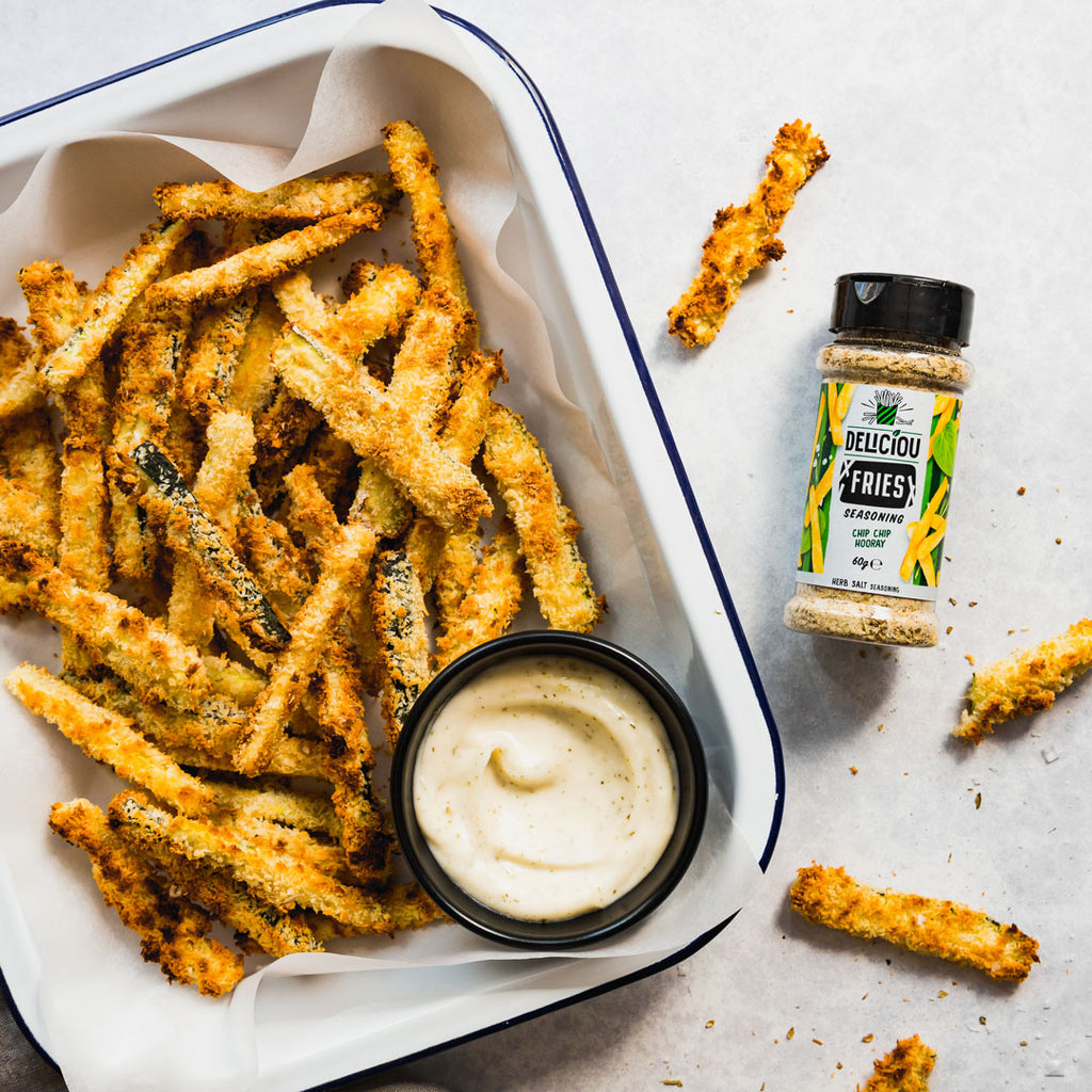 - To make up the flour mix, whisk together the flour, Deliciou Fries Seasoning and garlic powder in one bowl.